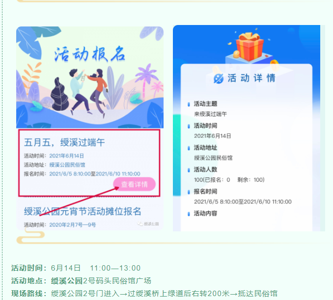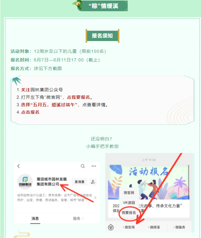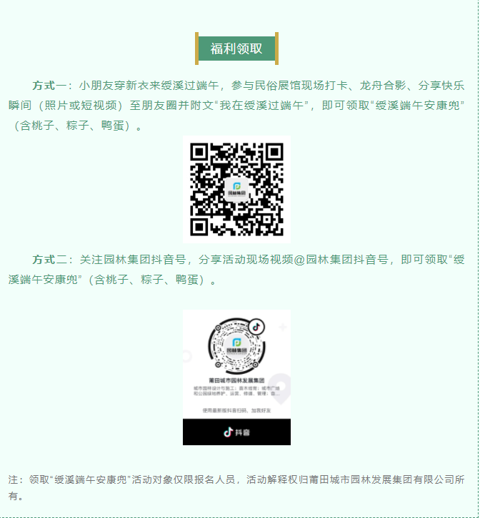 農歷五月初五是端午節(jié) 俗稱端陽或重五 興化方言稱"五日節(jié)” “初一糕,初二粽 初三螺,初四艾 初五爬龍舟,初六嘴企企” 每逢端午,記憶中這口口相傳的 莆田方言童謠 仿佛又把我們送回那純真的童年 濃濃鄉(xiāng)音的童謠承載著莆仙人民 代代相傳的特色端午文化習俗及情懷 五月五,綬溪邀您過端午 搭柴火灶、燒午時水 包粽子、煮鴨蛋 領蛋兜,觀龍舟 聽琴音裊裊,看溪水潺潺… 此情此景此活動,邀您盼您共體驗 話不多說,快來報名 劃重點! 仔細閱讀以下內容 福利~福利~