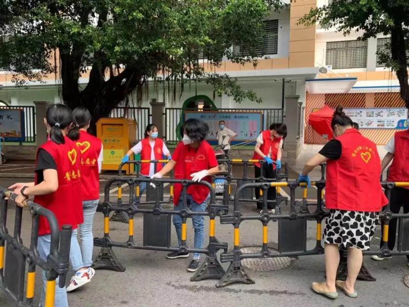 莆田市第二實驗小學(xué)門口龍橋社區(qū)核酸檢測點,園林志愿者們和社區(qū)工作人員準備著各項工作,搭建帳篷、設(shè)置圍欄、粘貼1米線、搬運物資......準備工作有條不紊的開展。