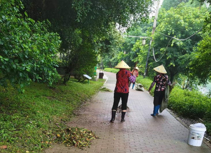 工作人員對管轄范圍內(nèi)的公園、綠道等地的樹葉、枯枝、積水、垃圾等進行全面清理。